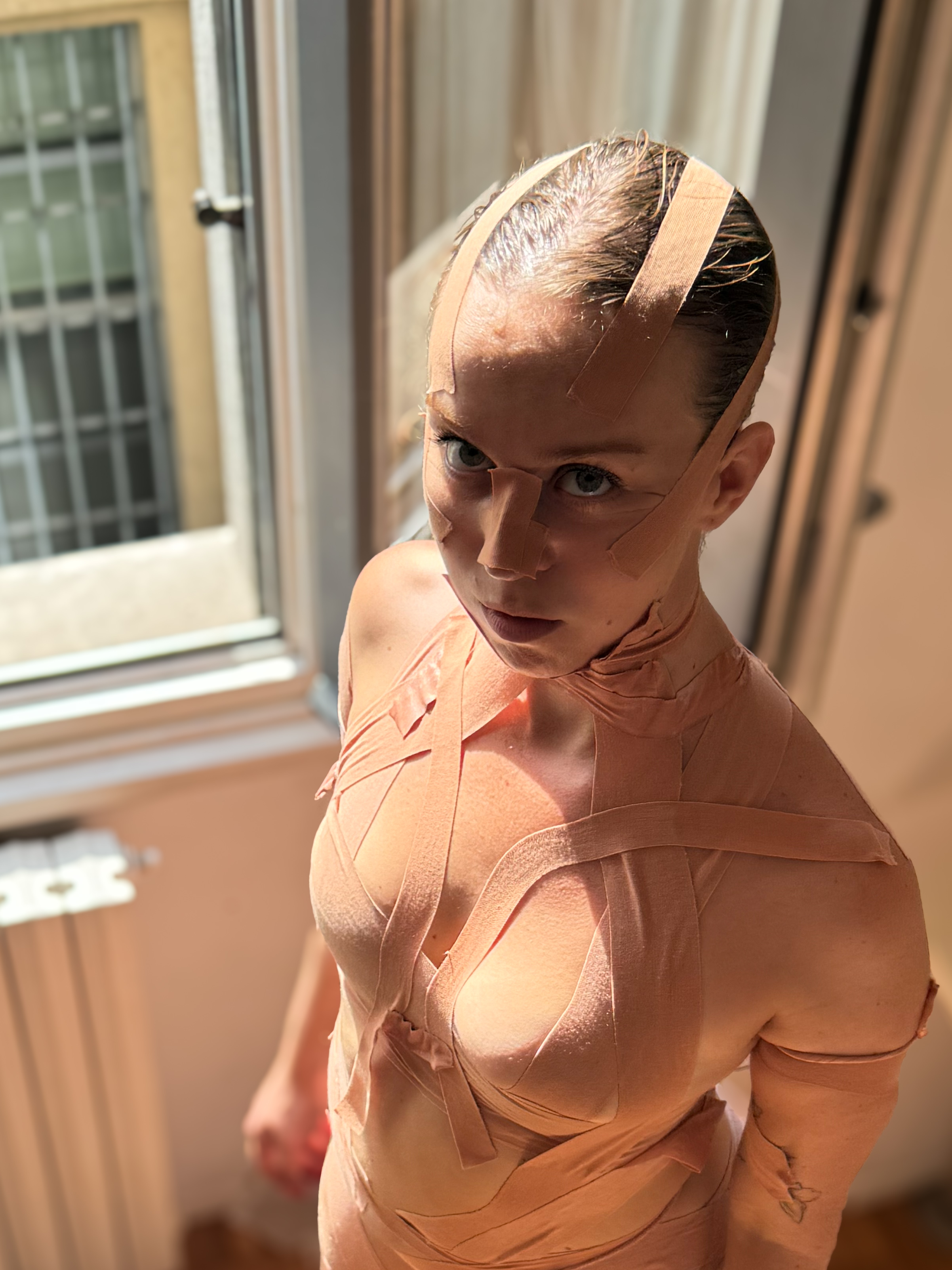 ALTARING is a durational live action that delves into the intricate relationship between bodily modification and the evolving sense of one’s self. Throughout the performance, Zosia methodically molds her body using body tape, transforming herself into an increasingly constrained and unrecognisable form. ALTARING invites the audience to reflect on the fluid nature of identity and the power of physical change, challenging the spectator to consider their own experiences and perceptions of their bodies.